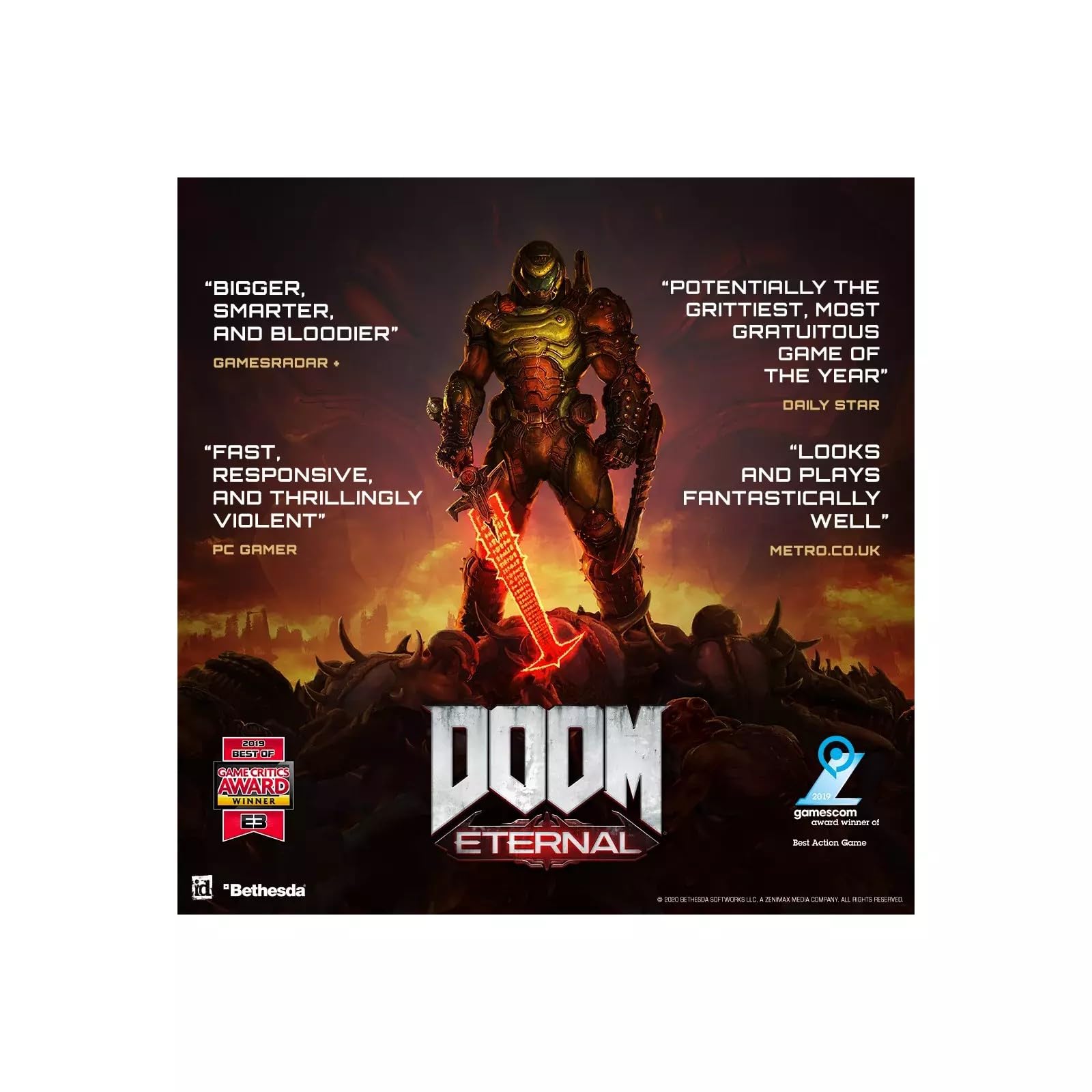 Details: Developed by id Software, DOOM Eternal is the direct sequel to DOOM, winner of The Game Awards' Best Action Game of 2016. Experience the ultimate combination of speed and power as you rip-and-tear your way across dimensions with the next leap in push-forward, first-person combat. Powered by idTech 7 and set to an all-new pulse-pounding soundtrack composed by Mick Gordon, DOOM Eternal puts you in control of the unstoppable DOOM Slayer as you blow apart new and classic demons with powerful weapons in unbelievable and never-before-seen worlds.
