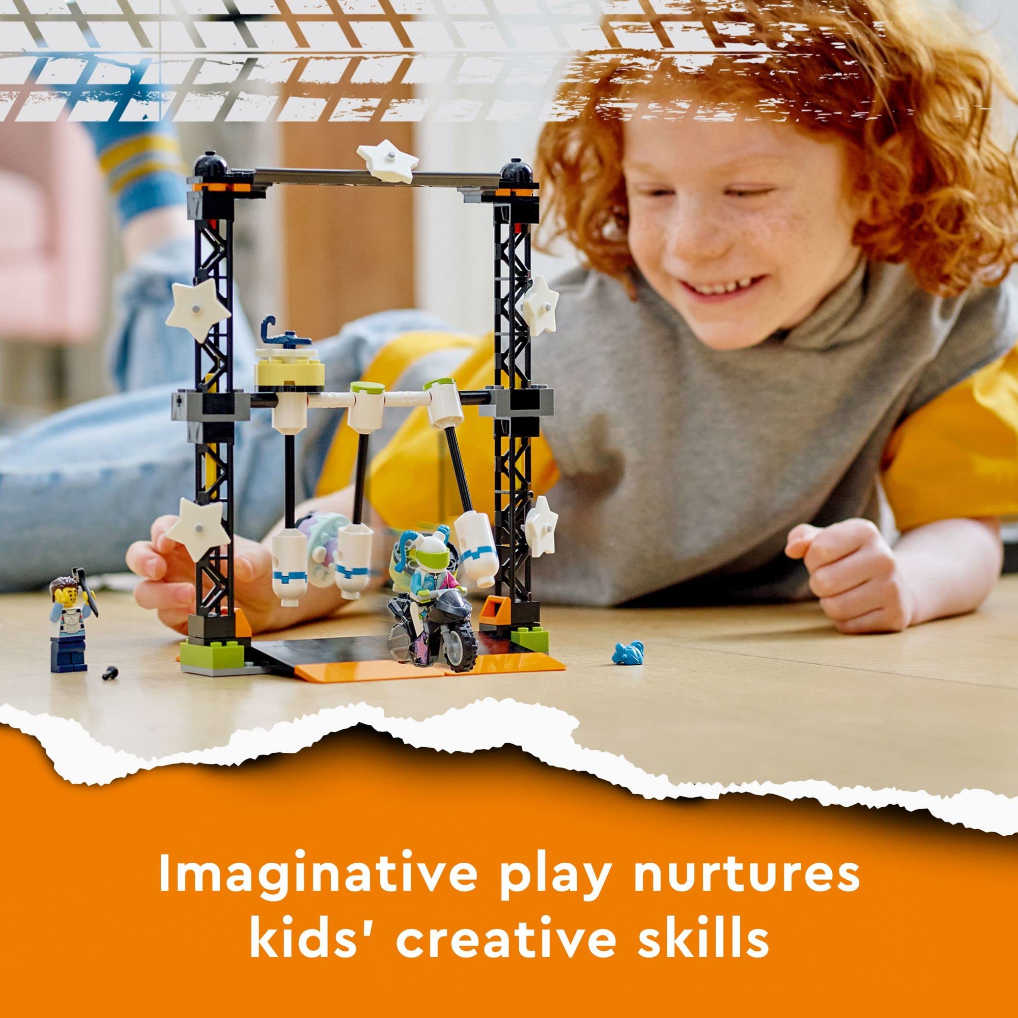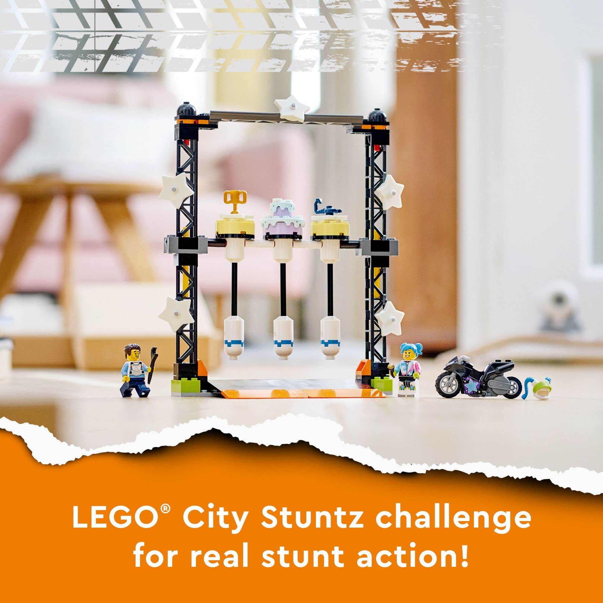 - Kids who like to compete will love this LEGO City Stuntz The Knockdown Stunt Challenge with toy motorcycle and glow-in-the-dark-elements