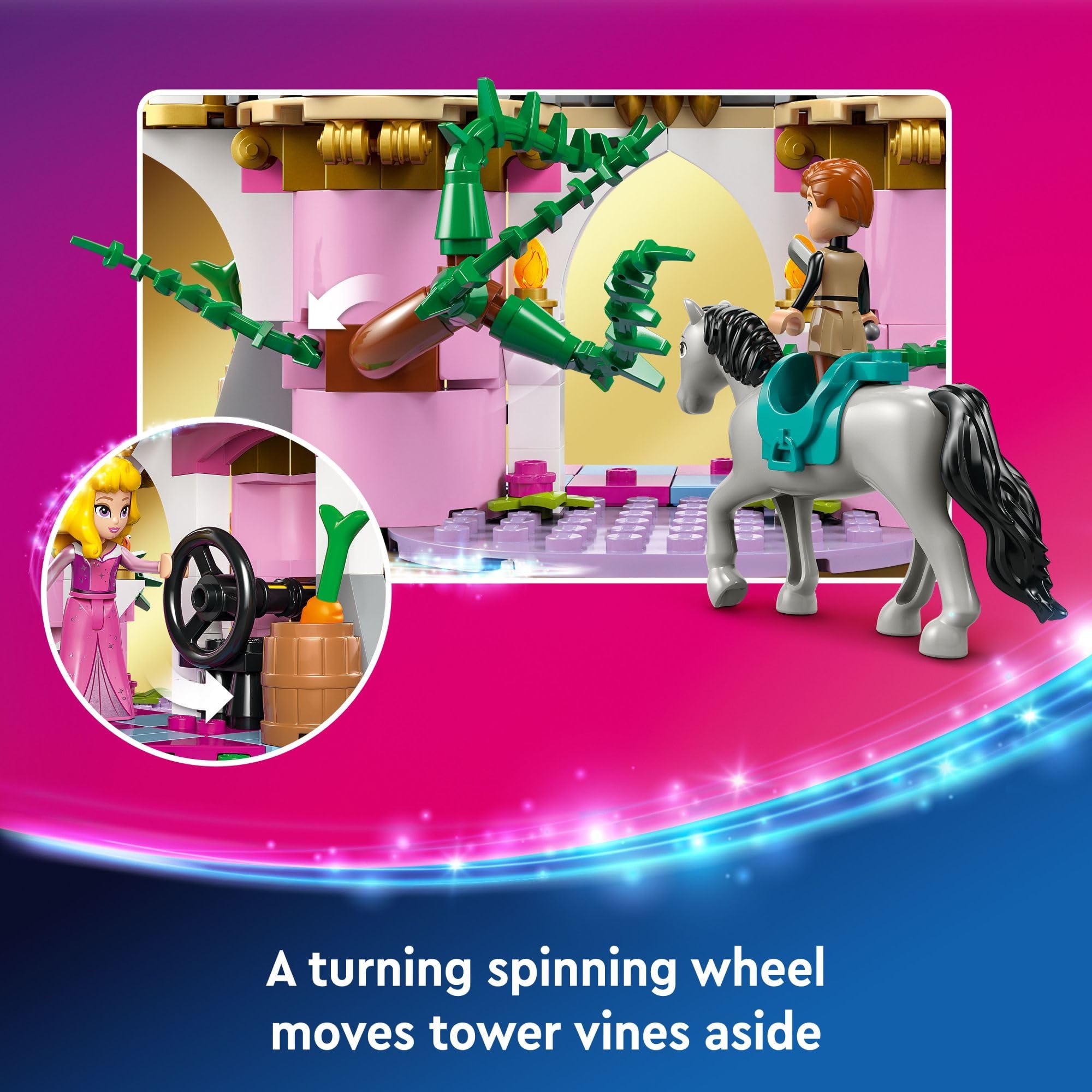 - Fun building set for kids – The buildable bridge with spires includes a bed for Aurora and a spinning wheel that moves the vines when turned, a suit of armor, wand and other play starters
