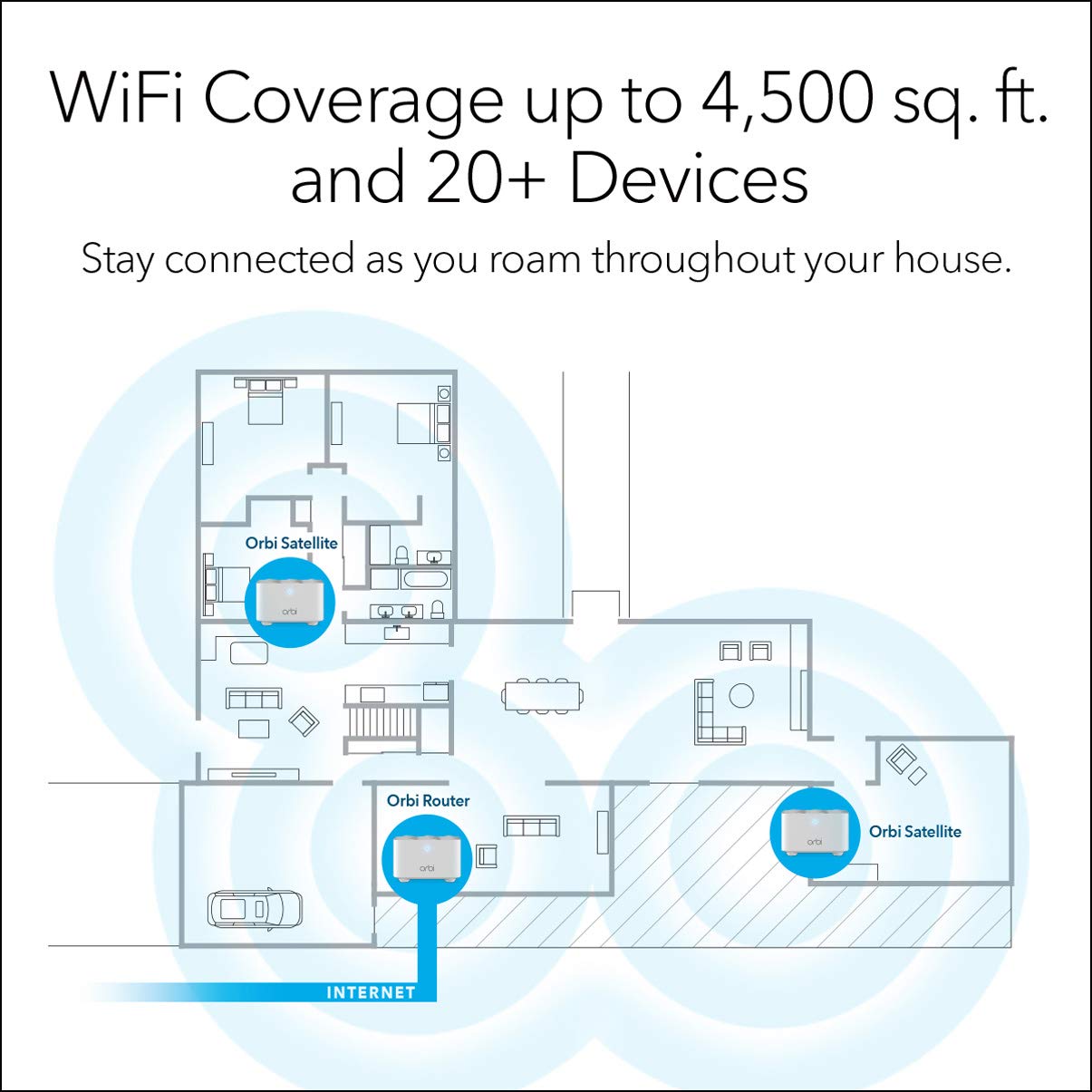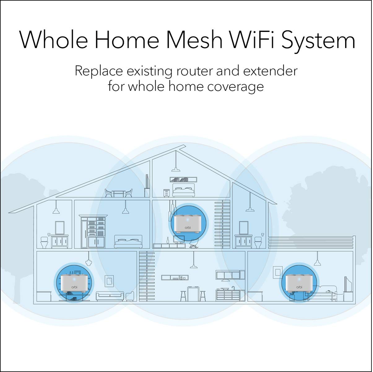 Details: Orbi whole home Mesh Wi-Fi System delivers up to 1.2Gbps high-performance Wi-Fi with up to 4, 500 square feet of coverage. Expand your home's Wi-Fi coverage to eliminate Wi-Fi dead zones and buffering. Keep a single Wi-Fi name for uninterrupted connections as you move from room-to-room. Orbi is ready right out of the box and works with your service provider, use the Orbi app to get online in minutes. Create a guest network, access parental controls, and run Speed tests right from the app. Use voice commands to control your home network with Amazon Lexa and the Google Assistant.