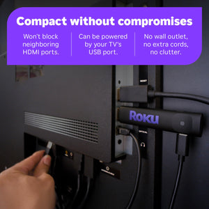 - Compact without compromises: The sleek design of Roku Streaming Stick won’t block neighboring HDMI ports, and it even powers from your TV alone, plugging into the back and staying out of sight. No wall outlet, no extra cords, no clutter.