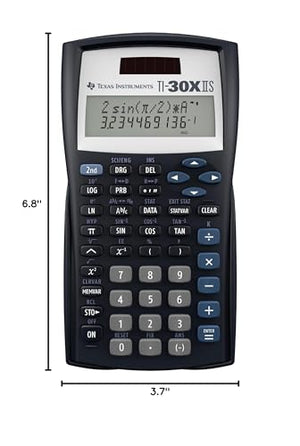 Details: Key features,Exam acceptance,The TI-30XIIS™ scientific calculator is approved for use on SAT, ACT, and AP exams. Ideal for General math, Pre-Algebra, Algebra 1 and 2, Geometry, Statistics and General science,Broaden exploration of math and science concepts,Review previous entries and look for patterns. A two-line display shows entries on the top line and results on the bottom line.,Perform advanced scientific functions,Features one- and two-variable statistics, recognizes ? as a symbol in radian mode, and provides menus that allow you to select settings appropriate for your calculation needs.,Perform operations with fractions and mixed numbers,Adds, subtracts, multiplies, and divides fractions entered in traditional numerator/denominator format.,Two-line display,Fraction features,Conversions,Basic scientific and trigonometric functions,Edit, cut, and paste entries,Solar and battery powered,One- and two-variable statistics